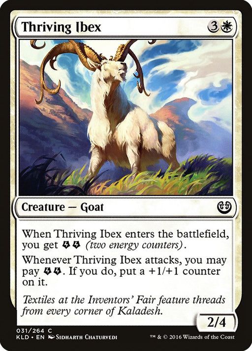 KaladeshIn stockWhen Thriving Ibex enters the battlefield, you get {E}{E} (two energy counters). Whenever Thriving Ibex attacks, you may pay {E}{E}. If you do, put...