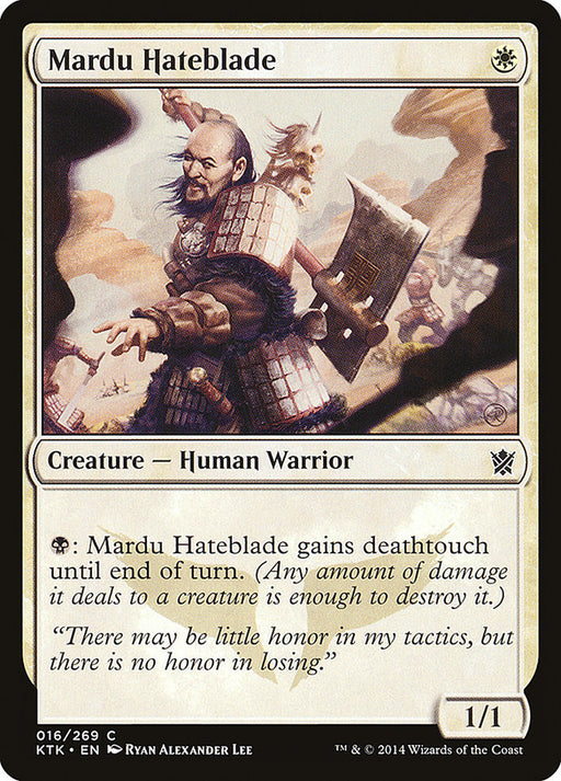 Khans of TarkirLow stock{B}: Mardu Hateblade gains deathtouch until end of turn. (Any amount of damage it deals to a creature is enough to destroy it.)
