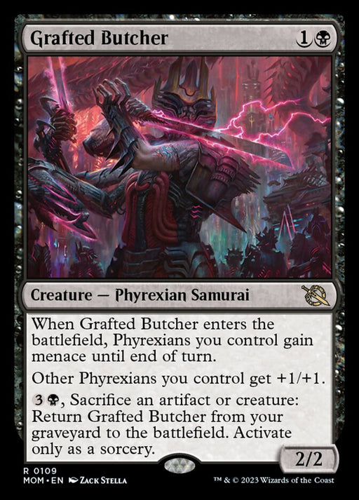 March of the MachineOut of stockWhen Grafted Butcher enters the battlefield, Phyrexians you control gain menace until end of turn. Other Phyrexians you control get +1/+1. {3}{B}, ...