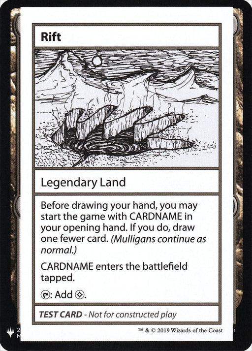Mystery Booster Playtest Cards 2019Out of stockBefore drawing your hand, you may start the game with Rift in your opening hand. If you do, draw one fewer card. (Mulligans continue as normal.) Ri...