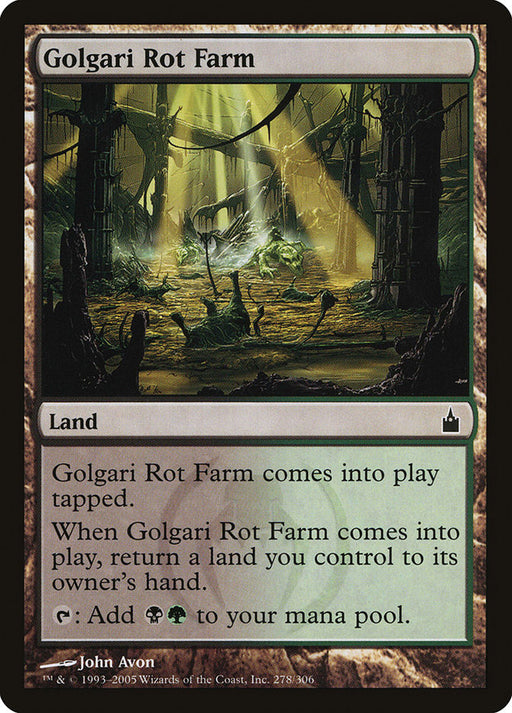 Ravnica: City of GuildsOut of stockGolgari Rot Farm enters the battlefield tapped. When Golgari Rot Farm enters the battlefield, return a land you control to its owner's hand. {T}: A...