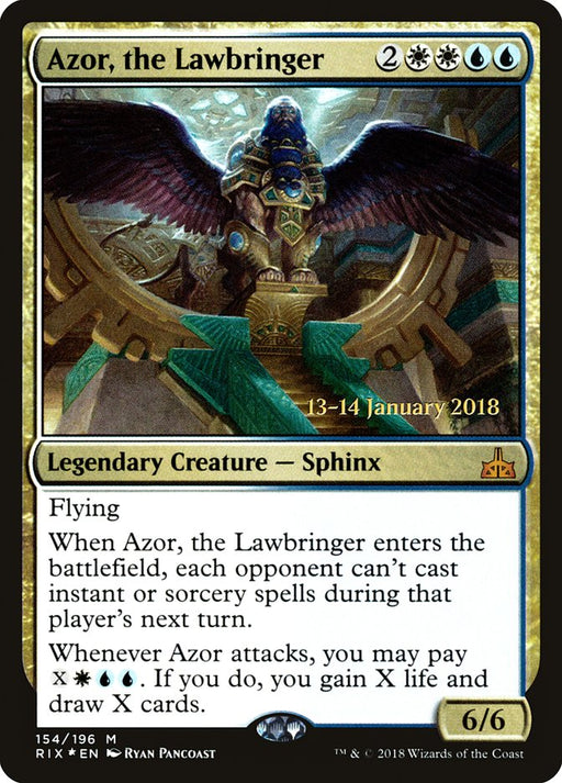 Rivals of Ixalan PromosOut of stockFlying When Azor, the Lawbringer enters the battlefield, each opponent can't cast instant or sorcery spells during that player's next turn. Whene...