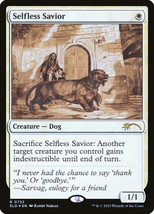 Secret Lair DropOut of stockSacrifice Selfless Savior: Another target creature you control gains indestructible until end of turn. (Damage and effects that say "destroy" don't...