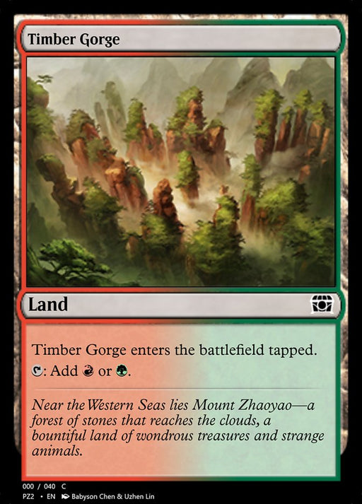 Treasure ChestOut of stockTimber Gorge enters the battlefield tapped. {T}: Add {R} or {G}.