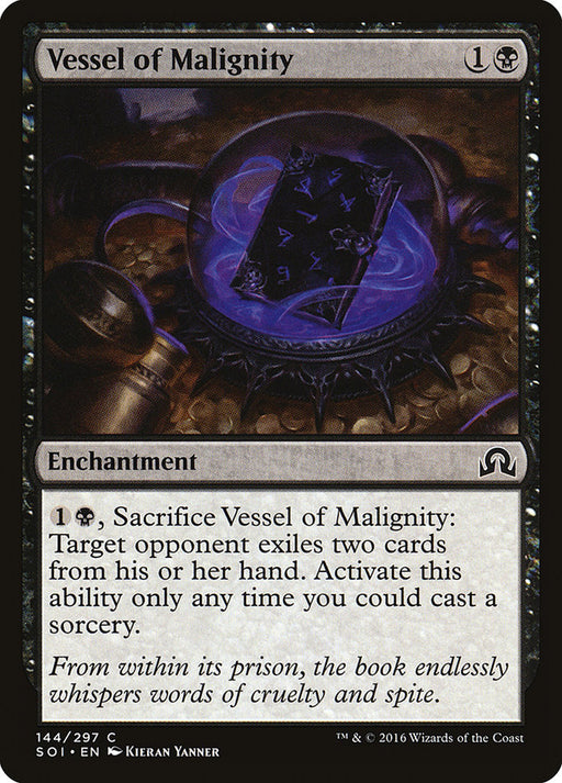 Shadows over InnistradIn stock{1}{B}, Sacrifice Vessel of Malignity: Target opponent exiles two cards from their hand. Activate this ability only any time you could cast a sorcery.