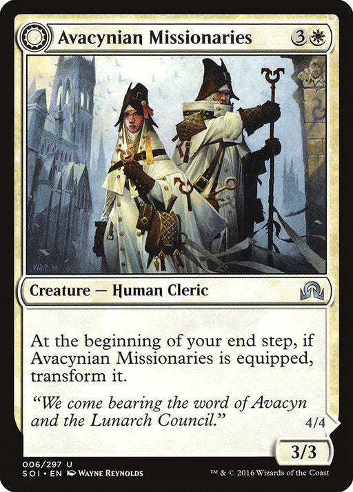 Shadows over InnistradIn stockAt the beginning of your end step, if Avacynian Missionaries is equipped, transform it.