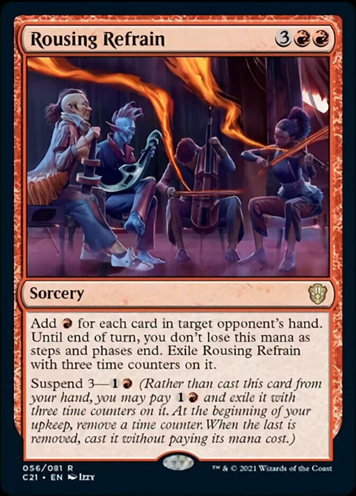 Commander 2021Out of stockAdd {R} for each card in target opponent's hand. Until end of turn, you don't lose this mana as steps and phases end. Exile Rousing Refrain with th...