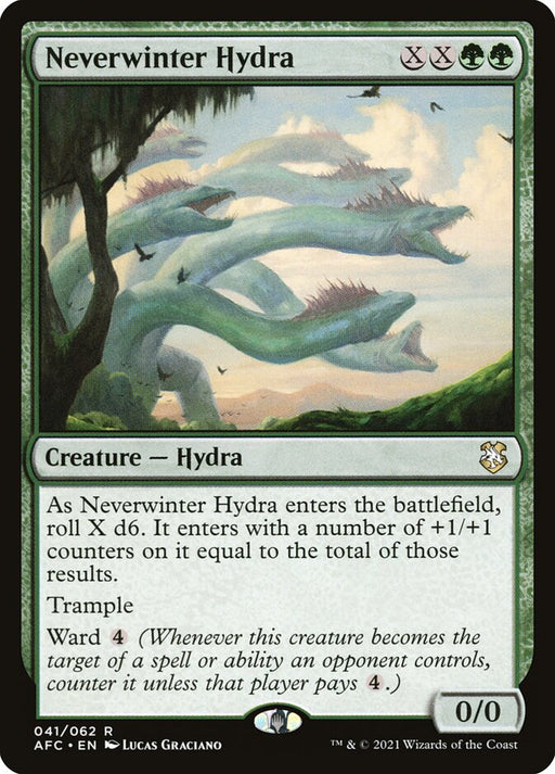 Forgotten Realms CommanderOut of stockAs Neverwinter Hydra enters the battlefield, roll X d6. It enters with a number of +1/+1 counters on it equal to the total of those results. Trampl...