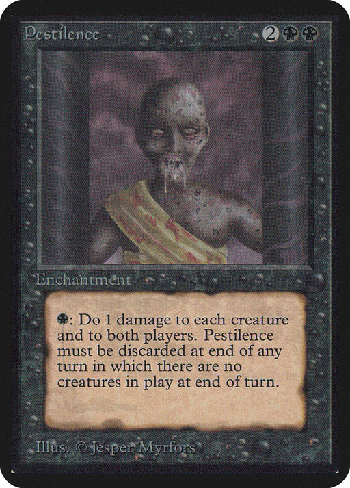 Limited Edition AlphaOut of stockAt the beginning of the end step, if no creatures are on the battlefield, sacrifice Pestilence. {B}: Pestilence deals 1 damage to each creature and...