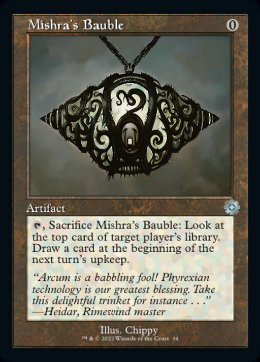 The Brothers' War Retro ArtifactsOut of stock{T}, Sacrifice Mishra's Bauble: Look at the top card of target player's library. Draw a card at the beginning of the next turn's upkeep.