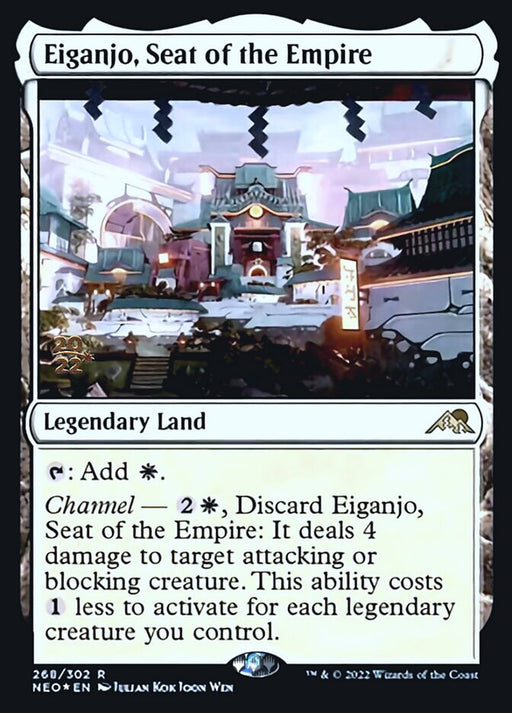 Kamigawa: Neon Dynasty PromosOut of stock{T}: Add {W}. Channel — {2}{W}, Discard Eiganjo, Seat of the Empire: It deals 4 damage to target attacking or blocking creature. This ability costs...