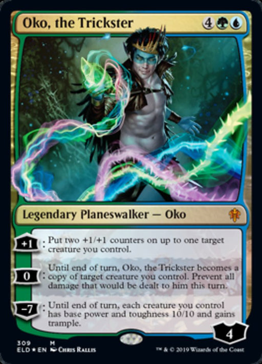 Throne of EldraineOut of stock[+1]: Put two +1/+1 counters on up to one target creature you control. [0]: Until end of turn, Oko, the Trickster becomes a copy of target creature...