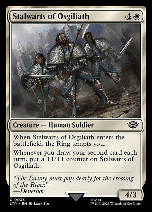 The Lord of the Rings: Tales of Middle-earthOut of stockWhen Stalwarts of Osgiliath enters the battlefield, the Ring tempts you. Whenever you draw your second card each turn, put a +1/+1 counter on Stalw...