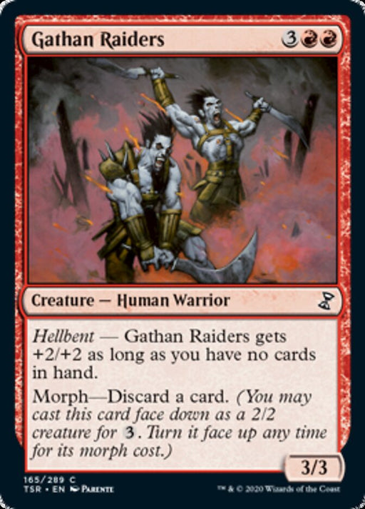 Time Spiral RemasteredLow stockHellbent — Gathan Raiders gets +2/+2 as long as you have no cards in hand. Morph—Discard a card. (You may cast this card face down as a 2/2 creatur...