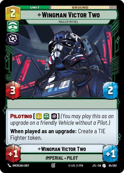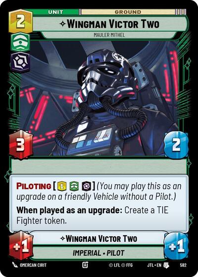 Jump to LightspeedEn stockPiloting [1, Command, Villainy](You may play this as an upgrade on a friendly Vehicle without a Pilot.) When played as an upgrade: Create a TIE ...