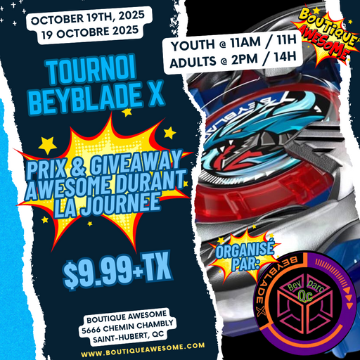 BA EventsRupture de stockCome join the Beyblade X Tournament at Boutique Awesome on Sunday, December 14 2025 at 11h. Allowed Equipment: Beyblade X, Hasbro/Takara TomyLimite...