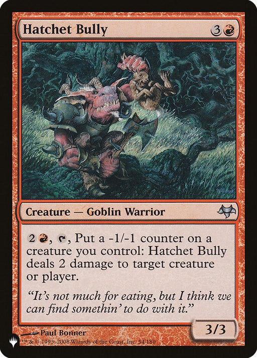 EventideRupture de stock{2}{R}, {T}, Put a -1/-1 counter on a creature you control: Hatchet Bully deals 2 damage to any target.