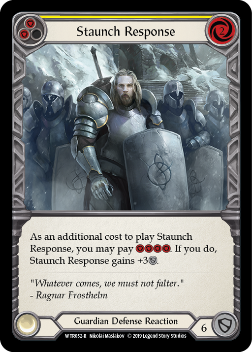 History Pack 1Stock basAs an additional cost to play Staunch Response, you may pay [4 resource]. If you do, Staunch Response gains +3[defense].