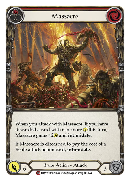 Crucible of WarRupture de stockIf you have discarded a card with 6 or more [Attack] this turn, Massacre gains +2 [Attack] and **intimidate**. If Massacre is discarded to pay the...