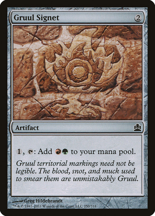 Commander 2011Rupture de stockGruul Turf enters the battlefield tapped. When Gruul Turf enters the battlefield, return a land you control to its owner's hand. {T}: Add {R}{G}.
