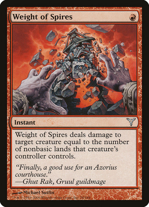 DissensionRupture de stockWeight of Spires deals damage to target creature equal to the number of nonbasic lands that creature's controller controls.
