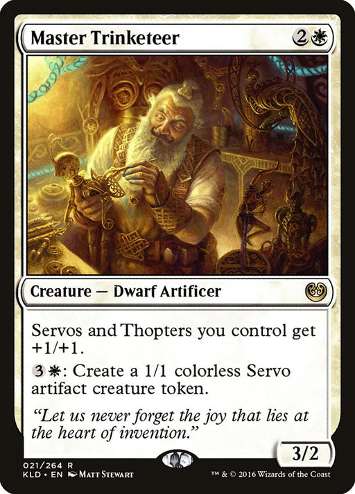 KaladeshEn stockServos and Thopters you control get +1/+1. {3}{W}: Create a 1/1 colorless Servo artifact creature token.