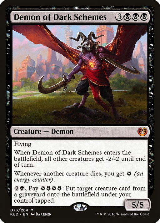 KaladeshStock basFlying When Demon of Dark Schemes enters the battlefield, all other creatures get -2/-2 until end of turn. Whenever another creature dies, you get ...