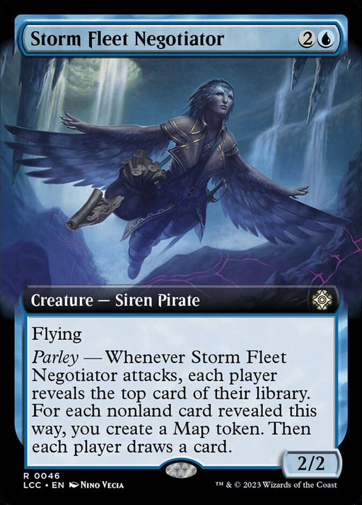 The Lost Caverns of Ixalan CommanderRupture de stockFlying Parley — Whenever Storm Fleet Negotiator attacks, each player reveals the top card of their library. For each nonland card revealed this way...