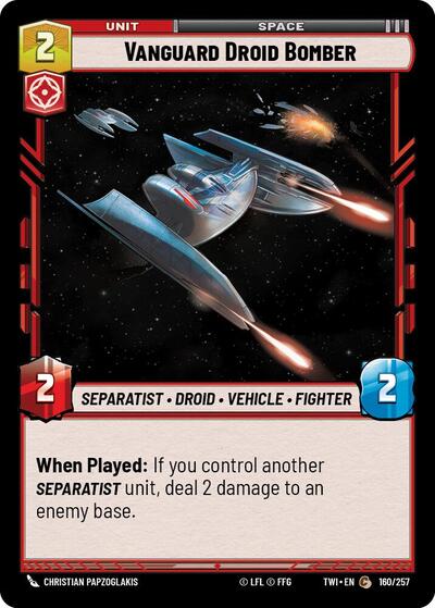 Twilight of the RepublicStock basWhen Played: If you control another Separatist unit, deal 2 damage to an enemy base.
