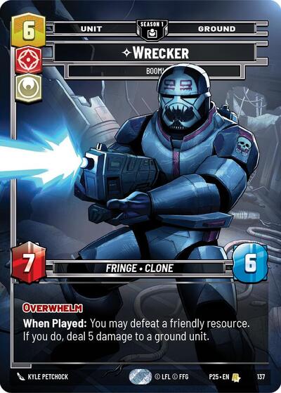 Sector and Regional Promos: Season 1Rupture de stockOverwhelmWhen Played: You may defeat a friendly resource. If you do, deal 5 damage to a ground unit.
