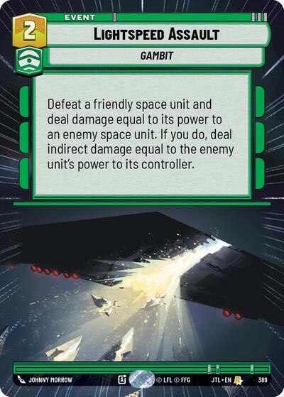 Jump to LightspeedEn stockDefeat a friendly space unit and deal damage equal to its power to an enemy space unit. If you do, deal indirect damage equal to the enemy unit's p...