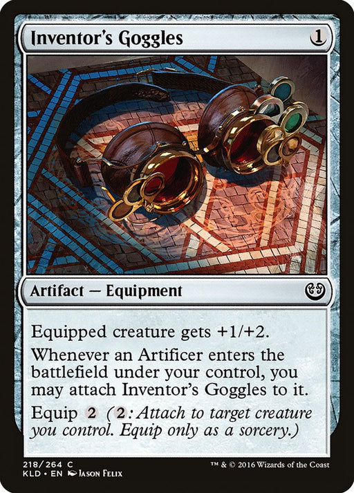 KaladeshEn stockEquipped creature gets +1/+2. Whenever an Artificer enters the battlefield under your control, you may attach Inventor's Goggles to it. Equip {2} (...