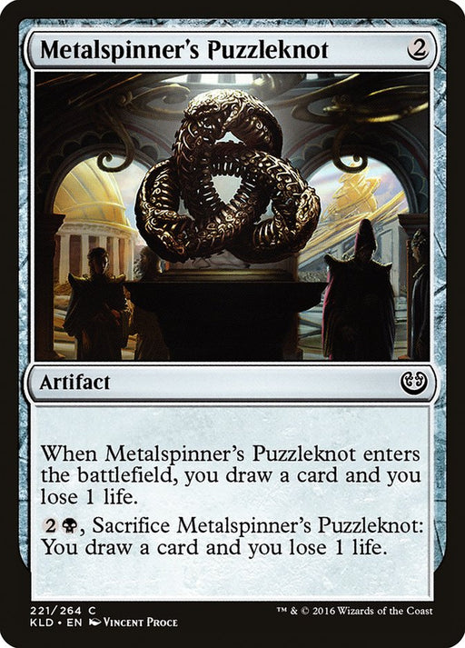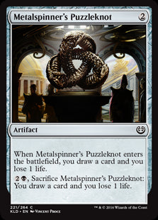 KaladeshEn stockWhen Metalspinner's Puzzleknot enters the battlefield, you draw a card and you lose 1 life. {2}{B}, Sacrifice Metalspinner's Puzzleknot: You draw a...