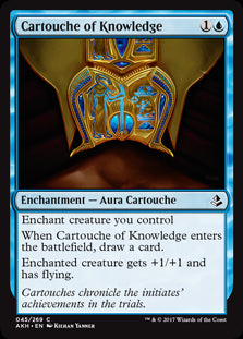AmonkhetEn stockEnchant creature you control When Cartouche of Knowledge enters the battlefield, draw a card. Enchanted creature gets +1/+1 and has flying.