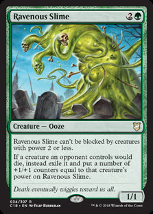 Commander 2018Stock basRavenous Slime can't be blocked by creatures with power 2 or less. If a creature an opponent controls would die, instead exile it and put a number ...