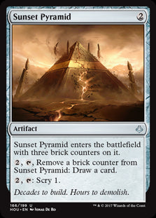 Hour of DevastationEn stockSunset Pyramid enters the battlefield with three brick counters on it. {2}, {T}, Remove a brick counter from Sunset Pyramid: Draw a card. {2}, {T}:...