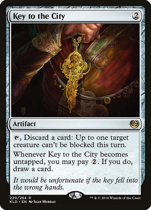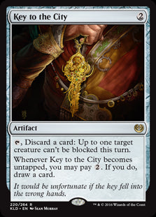 KaladeshEn stock{T}, Discard a card: Up to one target creature can't be blocked this turn. Whenever Key to the City becomes untapped, you may pay {2}. If you do, d...