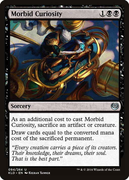 KaladeshEn stockAs an additional cost to cast this spell, sacrifice an artifact or creature. Draw cards equal to the converted mana cost of the sacrificed permanent.