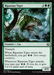 KaladeshEn stockTrample When Riparian Tiger enters the battlefield, you get {E}{E} (two energy counters). Whenever Riparian Tiger attacks, you may pay {E}{E}. If y...