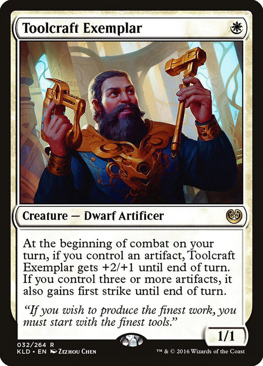 KaladeshEn stockAt the beginning of combat on your turn, if you control an artifact, Toolcraft Exemplar gets +2/+1 until end of turn. If you control three or more ...