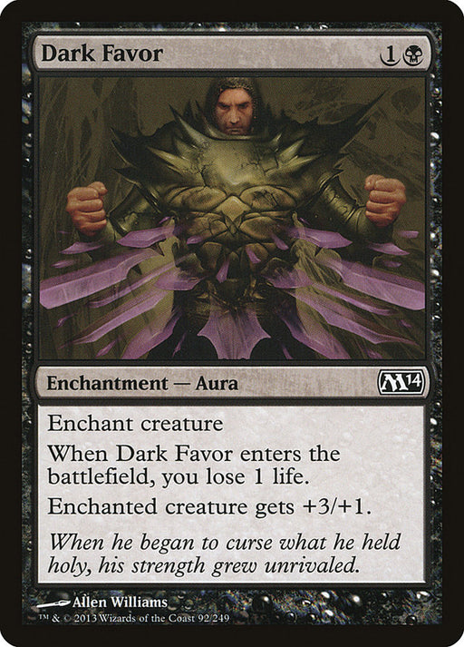 Magic 2014En stockEnchant creature When Dark Favor enters the battlefield, you lose 1 life. Enchanted creature gets +3/+1.