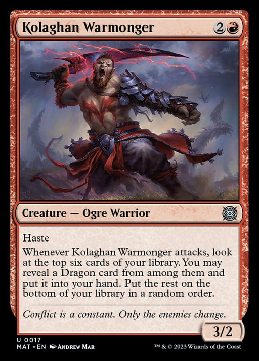 March of the Machine: The AftermathStock basHaste Whenever Kolaghan Warmonger attacks, look at the top six cards of your library. You may reveal a Dragon card from among them and put it into ...