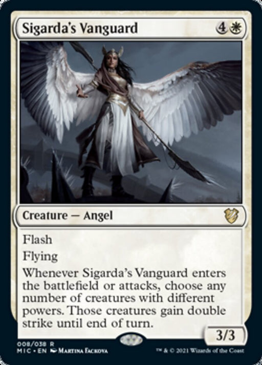 Midnight Hunt CommanderEn stockFlash Flying Whenever Sigarda's Vanguard enters the battlefield or attacks, choose any number of creatures with different powers. Those creatures g...