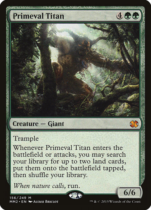 Modern Masters 2015Stock basTrample Whenever Primeval Titan enters the battlefield or attacks, you may search your library for up to two land cards, put them onto the battlefi...