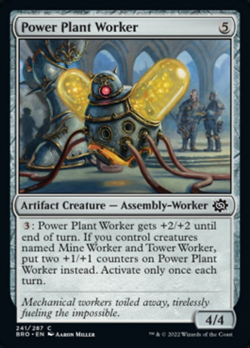 The Brothers' WarEn stock{3}: Power Plant Worker gets +2/+2 until end of turn. If you control creatures named Mine Worker and Tower Worker, put two +1/+1 counters on Power ...