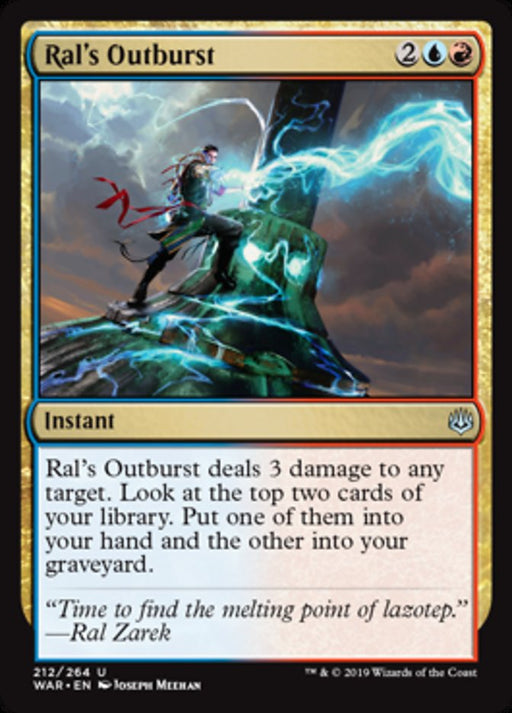 War of the SparkEn stockRal's Outburst deals 3 damage to any target. Look at the top two cards of your library. Put one of them into your hand and the other into your grav...
