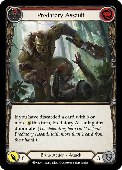 Crucible of WarStock basIf you have discarded a card with 6 or more [Attack] this turn, Predatory Assault gains **dominate**. *(The defending hero can't defend Predatory A...
