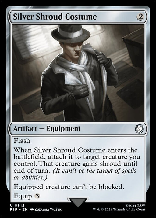 FalloutRupture de stockFlash When Silver Shroud Costume enters the battlefield, attach it to target creature you control. That creature gains shroud until end of turn. (I...