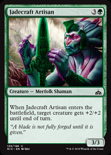 Rivals of IxalanEn stockWhen Jadecraft Artisan enters the battlefield, target creature gets +2/+2 until end of turn.