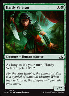 Rivals of IxalanEn stockAs long as it's your turn, Hardy Veteran gets +0/+2.
